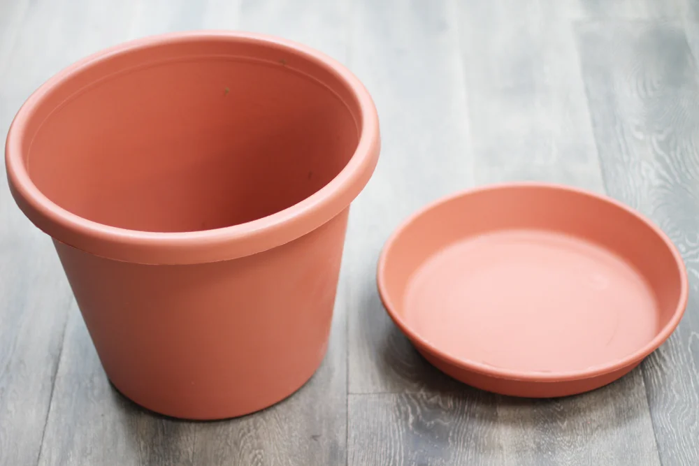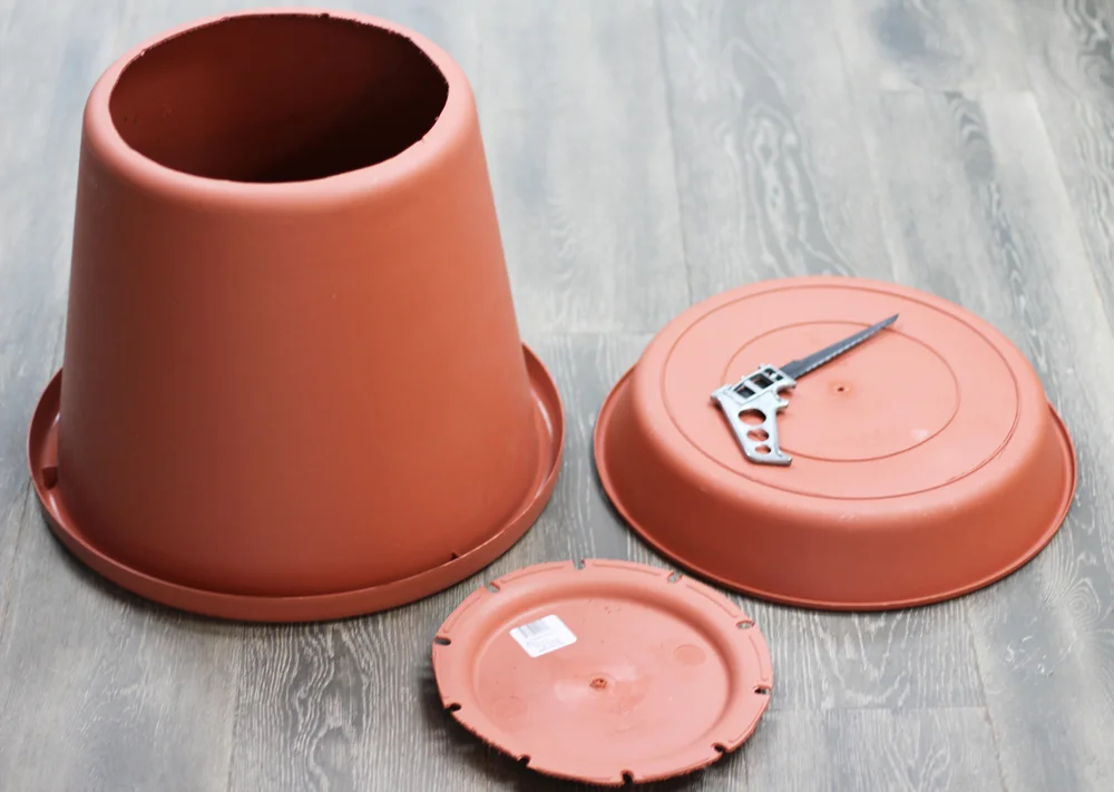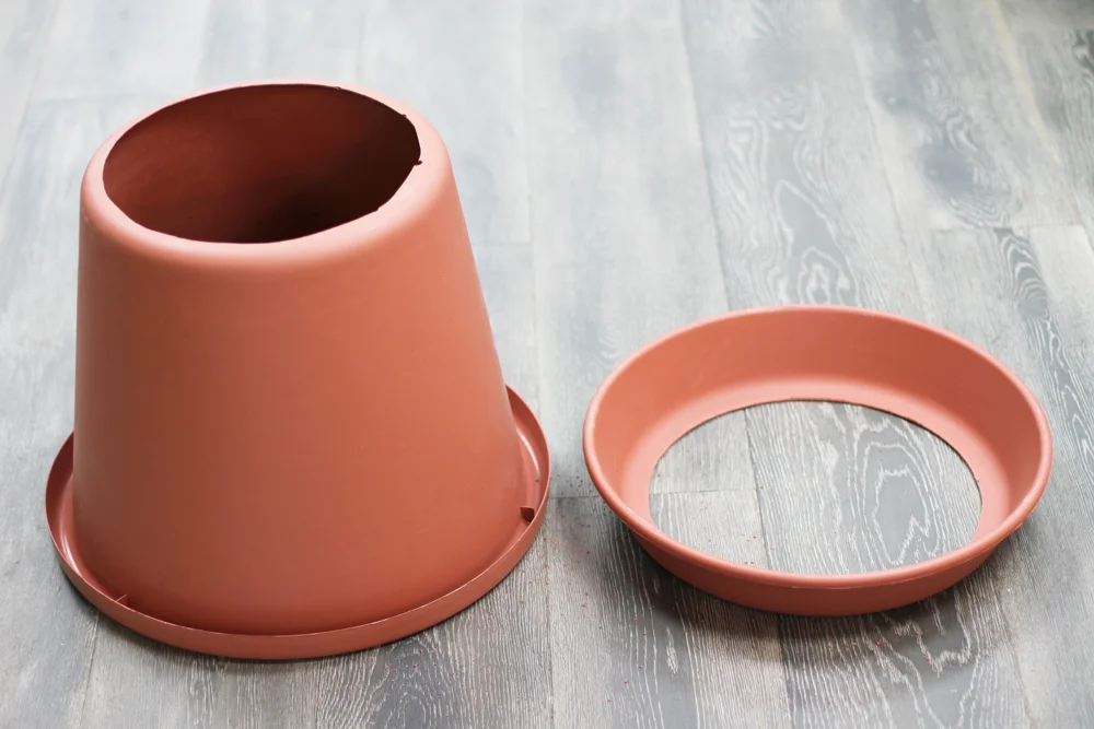 1. Flip your flower pot upside down and using a saw cut out the center of the pot. Make sure to also cut out the center of the base as well.