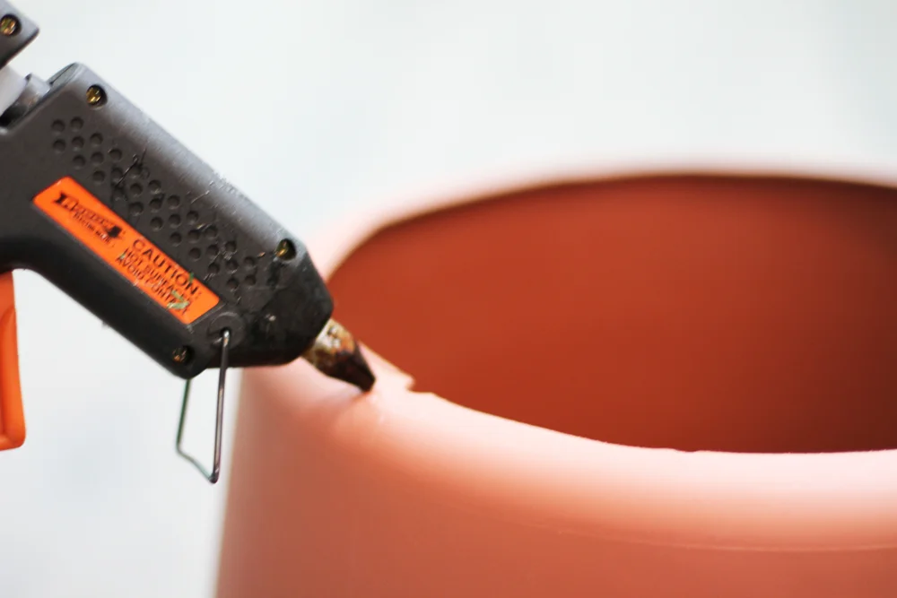 Let the hot glue dry and using Epoxy 6000 glue the entire rim where the base of the pot and the base meet. The Epoxy is stronger than the hot glue and wont pull off later. The hot glue was simply to set everything in place.