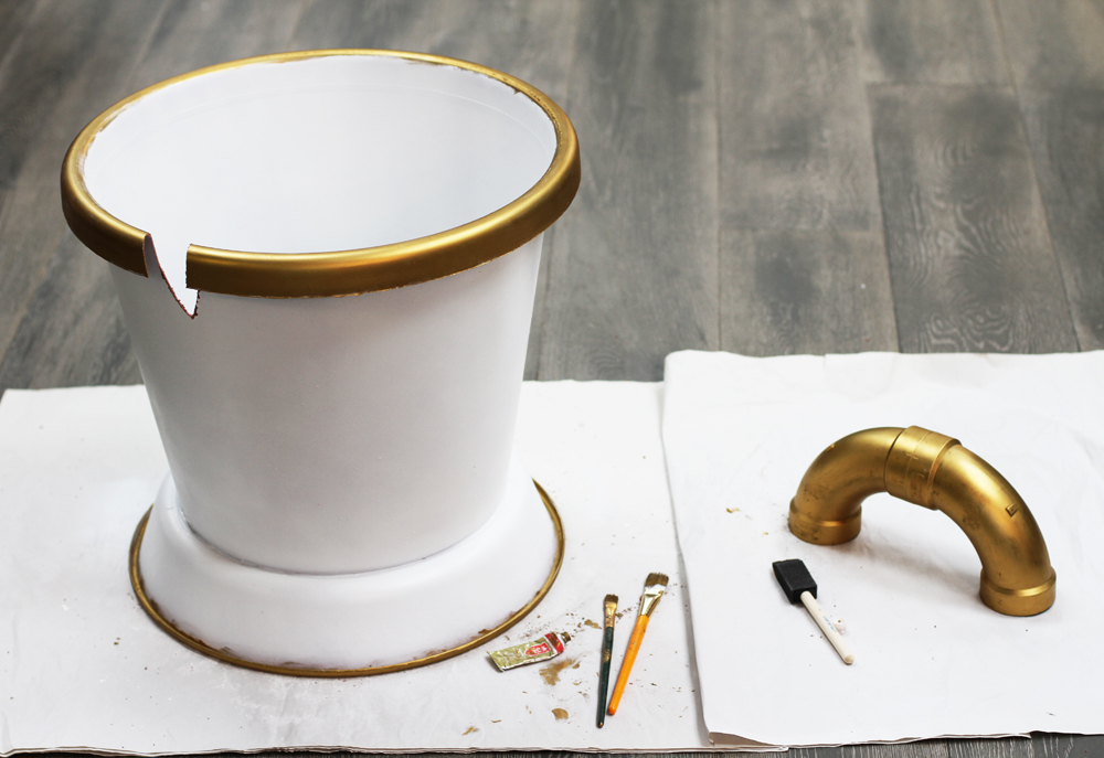 Now spray paint your flower pot white and paint the top rim and base rim gold as well just like the Chip character in Beauty and the Beast.