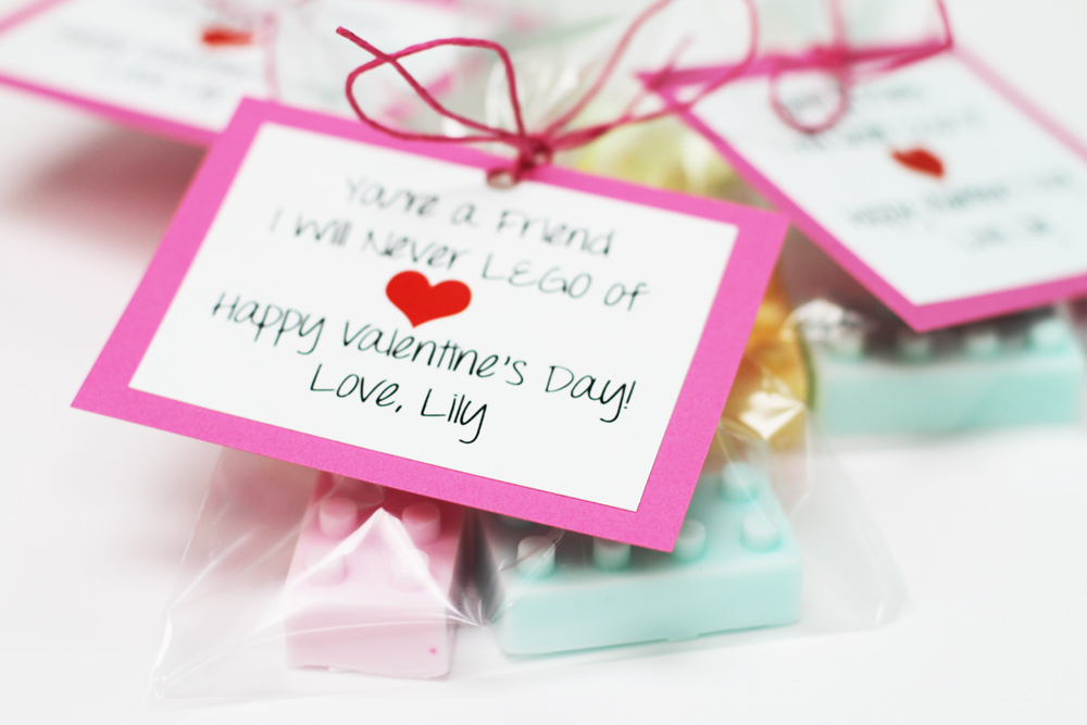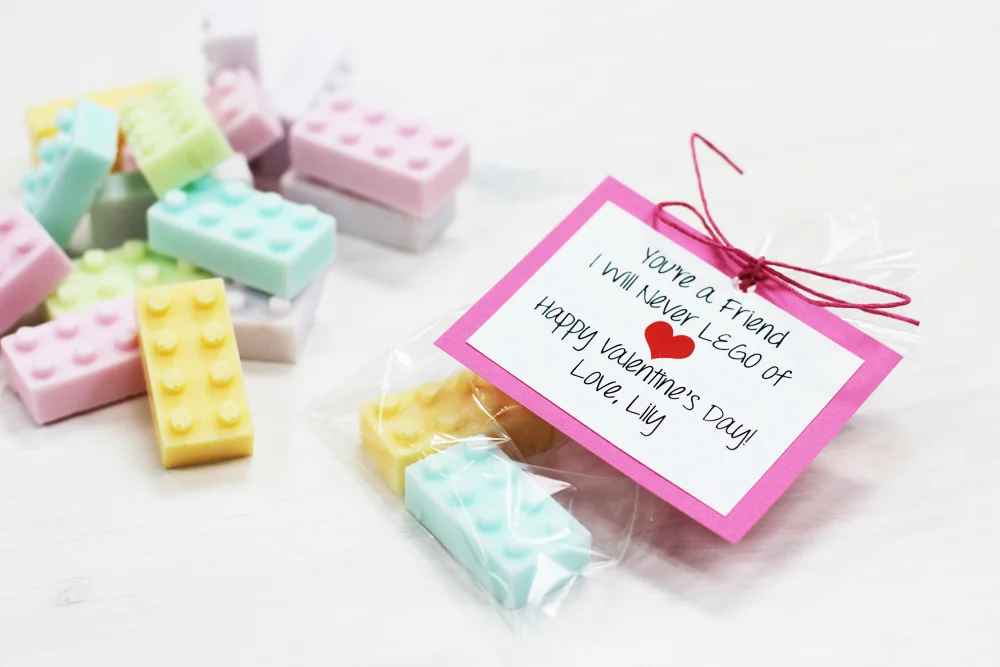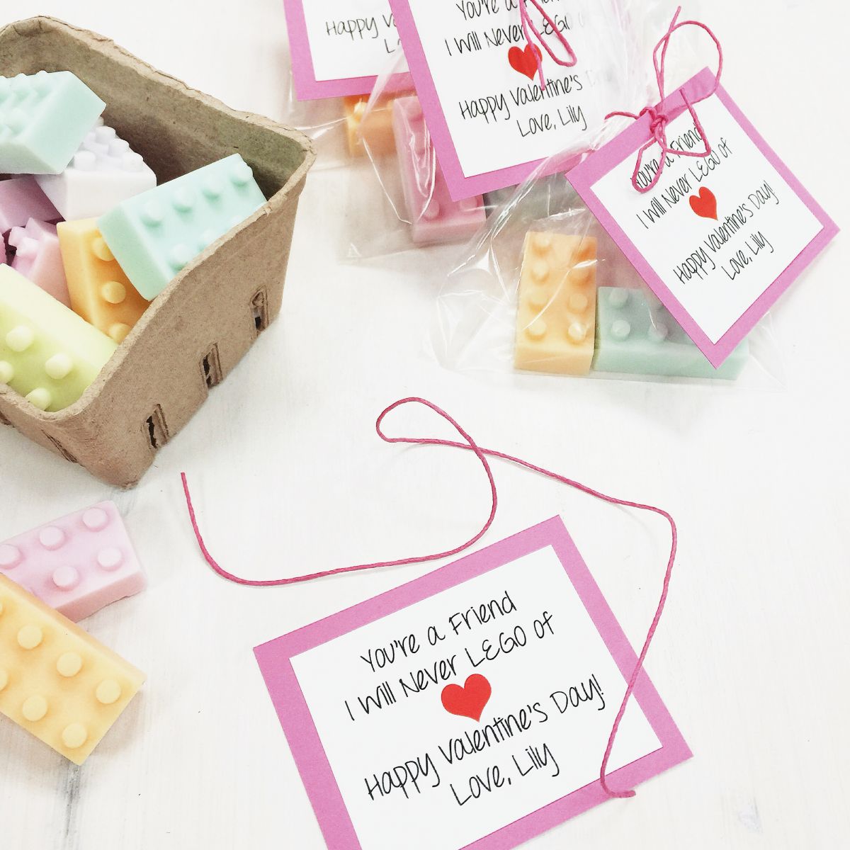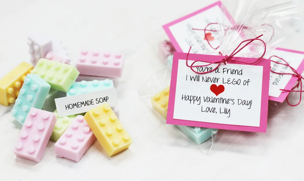 My daughter Lily is really into Legos right now. We have them all over the place .... all over the place. No, seriously, they ought to come with a special Lego vacuum that can suck up all the Legos on the floor .... and maybe it can put them away and organize them as well. Ok, fine that will never happen. So I took out our Lego mold this week (I used it to make Chocolate Legos last year) and I thought we could use it to make some fun soaps. Well the soaps looked so cool that we decided to give them out as Valentine's to Lily's class. We even made the soaps in pastel colors so they are absolutely perfect for Valentine's Day. The tutorial and templates are below!