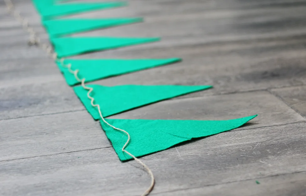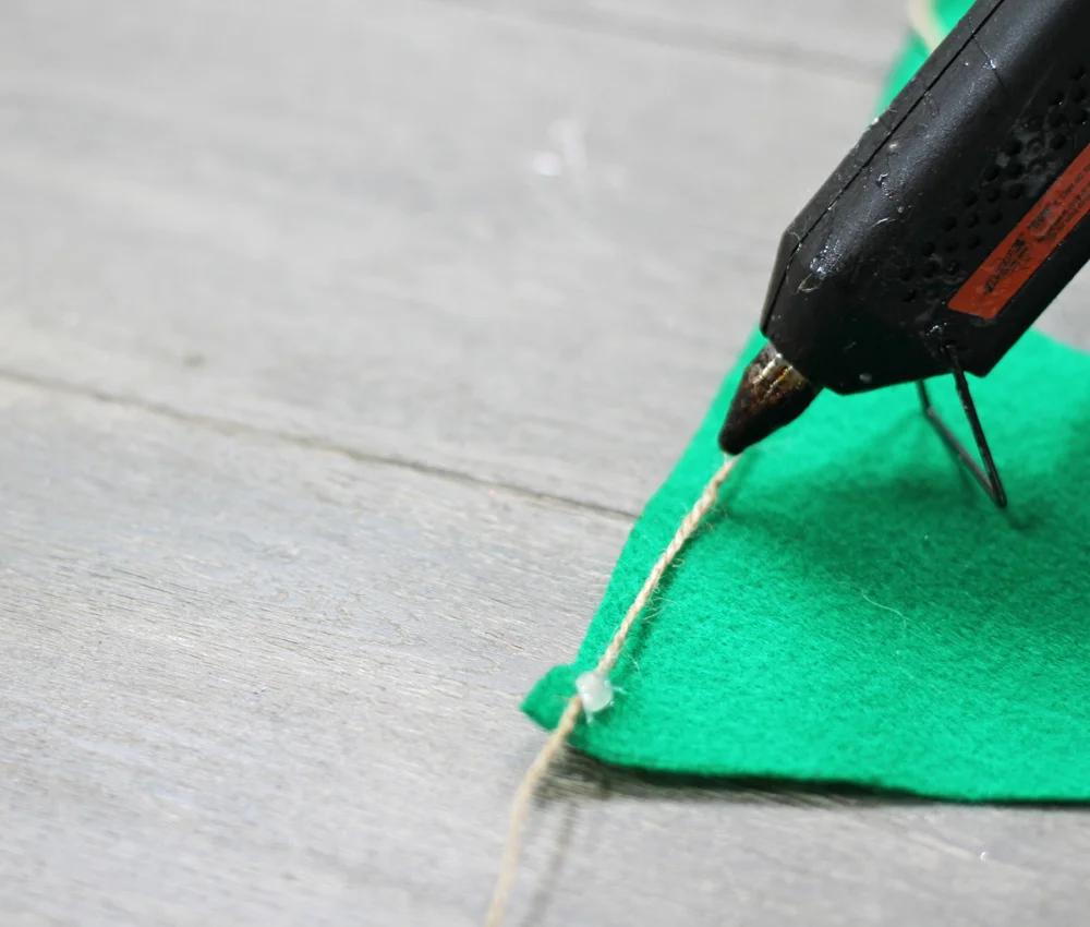 3. Cut out 12 felt triangles and lay them on a flat surface next to each other, while stretching your twine across the top of every pennant. Hot glue the twine across the pennant with little dabs of glue and let dry. TIP: Leave at least 12" of twine on both sides of the pennant banner so you can tie it to your table etc.