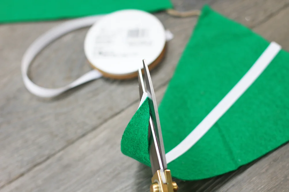 4. Flip the pennant banner over and add white ribbon down the center of each flag using regular tacky glue. Let dry, then cut the ribbon into a triangle at the bottom of the pennant and cut off any remaining ribbon hanging off the top.