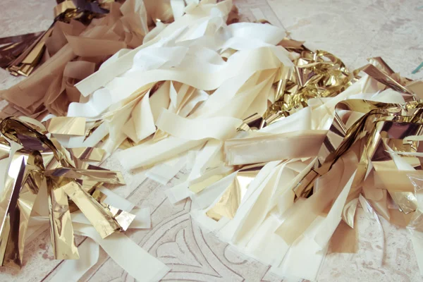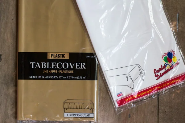Alright, let's get started. For the fringe we used these super cheap classic plastic table covers. These are $1 each and you get 12 fringe tassels out of each table cover.