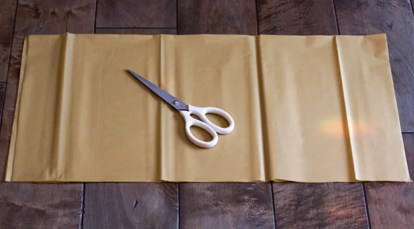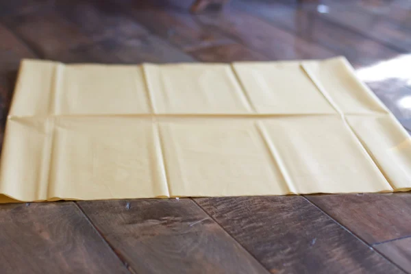 Completely unfold your plastic table cover until it's only folded in half ONE time. It should be folded horizontally once.