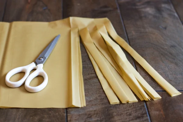 Using scissors, I cut one inch strips. Be sure to leave a 2" inch space on top. You do not want to cut the strips off. Leave them attached.
