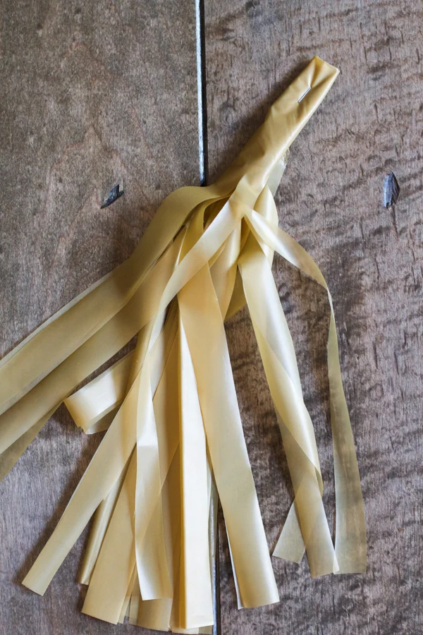 Now you are going to attach your first tassel. You want to secure it to the top of the ribbon, at the base of the balloon.