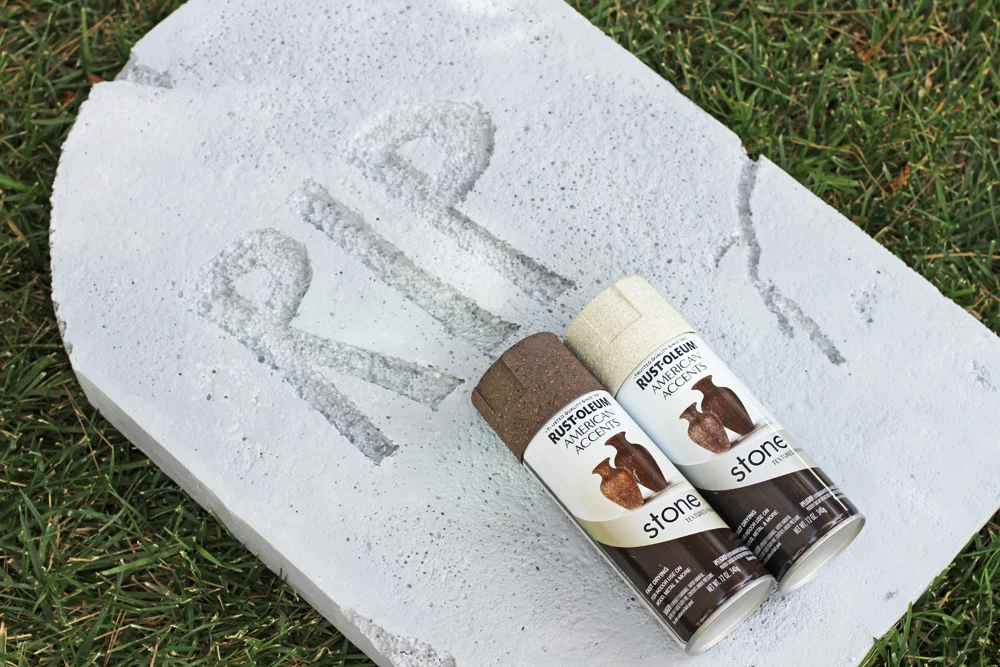 And let dry. Now here is the optional part. You want to make the tombstone look even creepier. So you can hit it with some darker stain inside the lettering or you can add these cool rock spray paints (which is literally dirt, mixed with spray paint) or you can paint some darker brown paint inside the lettering and then put some actual dirt on it while it's wet.