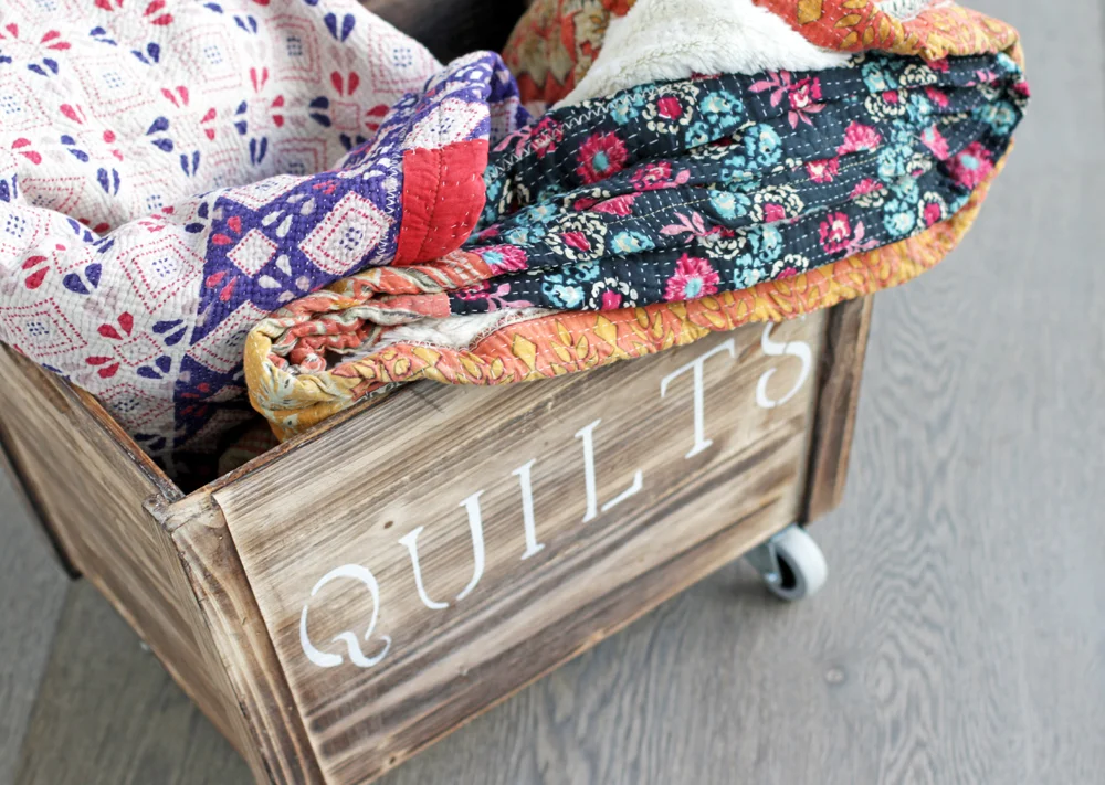 1. Flip your crate over and place your casters in place. Screw down all four casters. If you have a thin base on your crate the screws will poke through the bottom so you can glue a square scrap piece of wood on the inside to catch the screw.