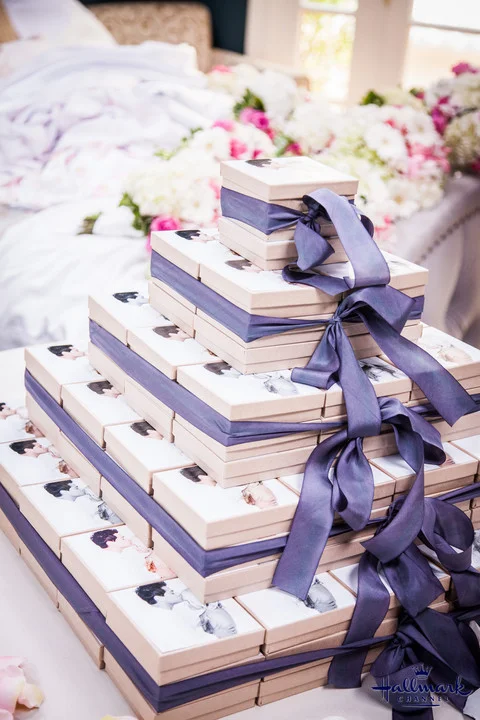 I had to come up with a wedding favor idea for the 170 guests at Charlie and Gabbi's wedding on the Hallmark Channel this past week and I wanted it to be special, but also very unique. I decided on using these gorgeous monogrammed wedding cookies from Clearly Cookies and putting them in photo boxes stacked up like a cake! The wedding favor cake looked amazing. Scroll down to see how I did it!