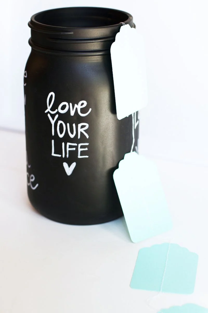 Spray paint your mason jar with the chalkboard spray paint. Let dry and use the chalkboard marker to write inspirational words all over the jar then fill with your dreams!
