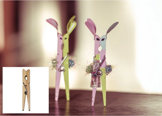 1. Using your scissors, cut out a small set of bunny ears for both sides of your clothespin so that you have four ears total, and two small pieces of your wire ribbon or cotton for your bunny tails. Set aside for later.