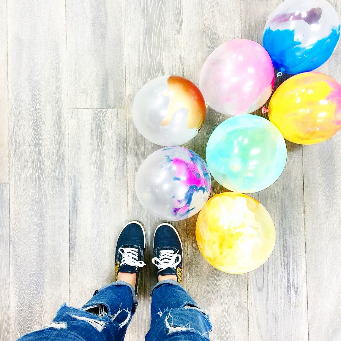 5. Blow up the balloons after a couple hours and tie as you normally would. I let my balloons chill overnight on my counter or hard floor so they are fully dry (incase they pop). Once dry, it's OK if the balloons pop because the paint wont splatter at all.