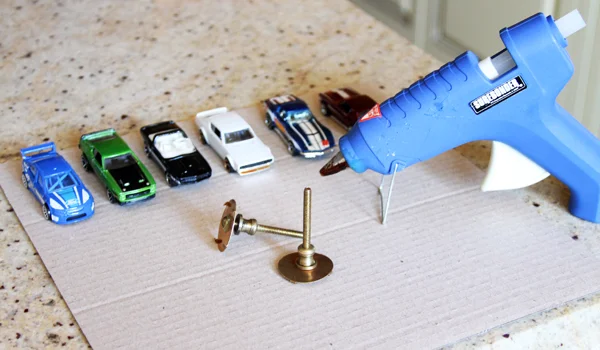 You need Hot Wheel cars, knob backers (these can be found at any hardware store) and a glue gun.