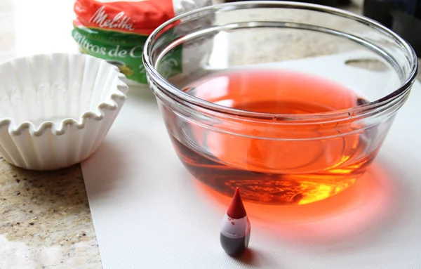 Now depending on what color you want your filters to be you need to add food coloring. I added 3 drops of red to get a light pink. If you want a light brown color, you can use 1 cup of strong coffee (no water) - just the cup of brewed coffee (which obviously already has water in it).