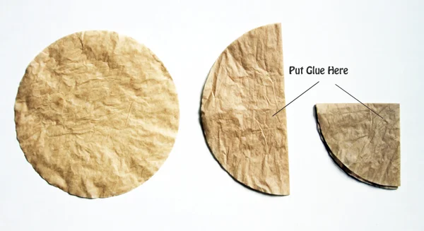 Fold all your filters. Fold in half first like a taco then place a dot of hot glue in the center of the taco and fold once more. You will add another dot of glue at the bottom of the folded filter and attach this directly to the paper lantern.