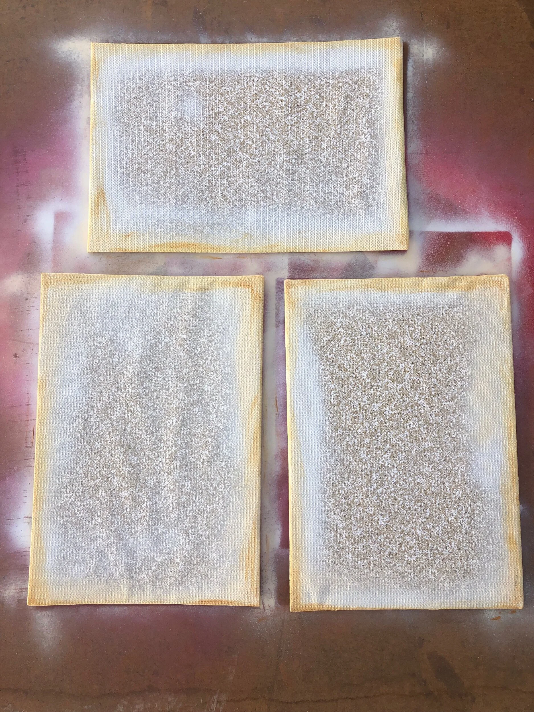 Spray the felt with yellow spray paint and let dry. Make sure it fits perfectly in your small bin on top of the sponges. Do not hot glue yet. Set aside.
