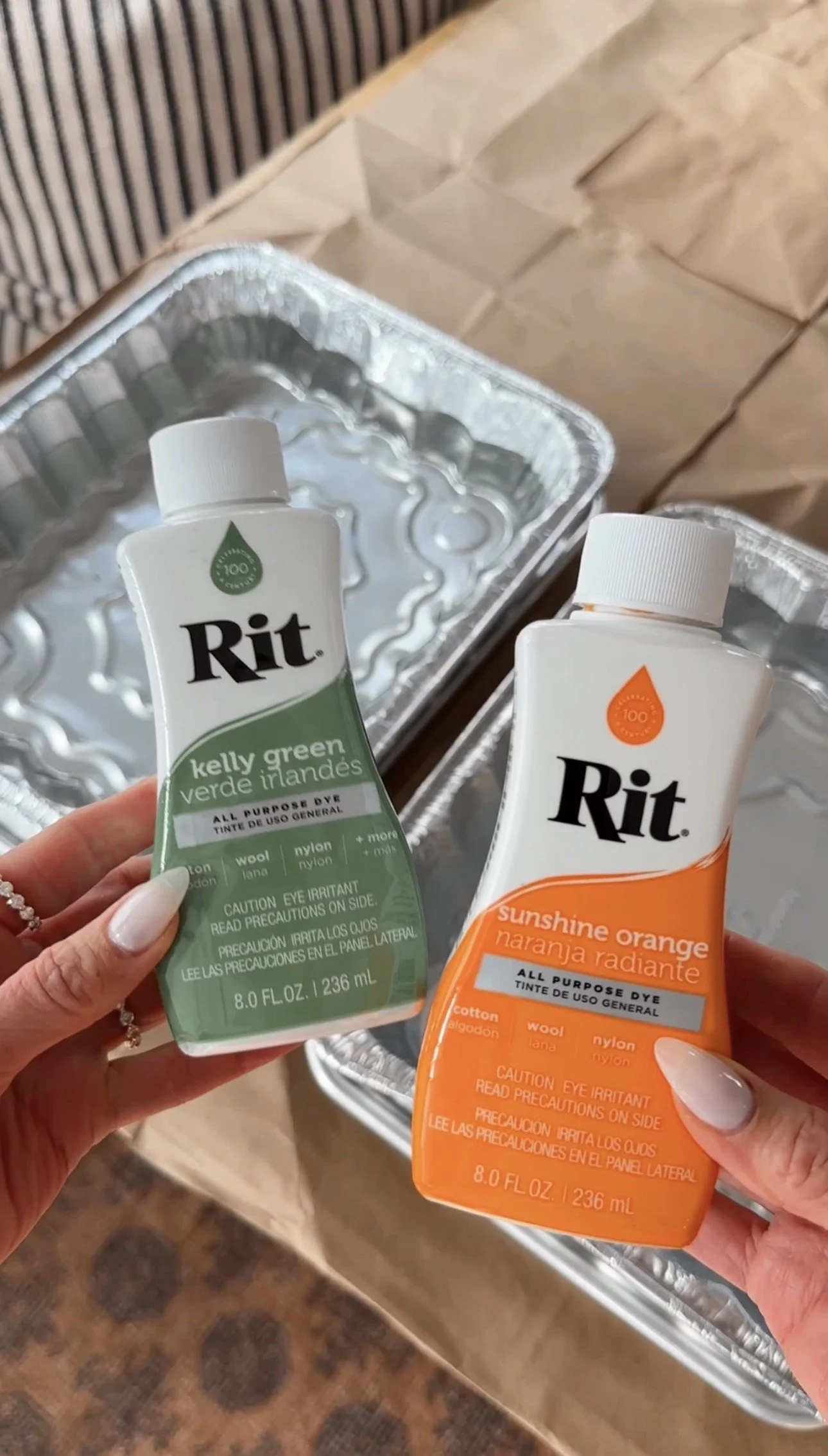 Add the orange, fuchsia, and green RIT dyes to separate containers or foil pans filled with water, following the dye package directions. I added 1/2 a bottle (4oz) to the half sheet foil pan to get my vibrant carrots.