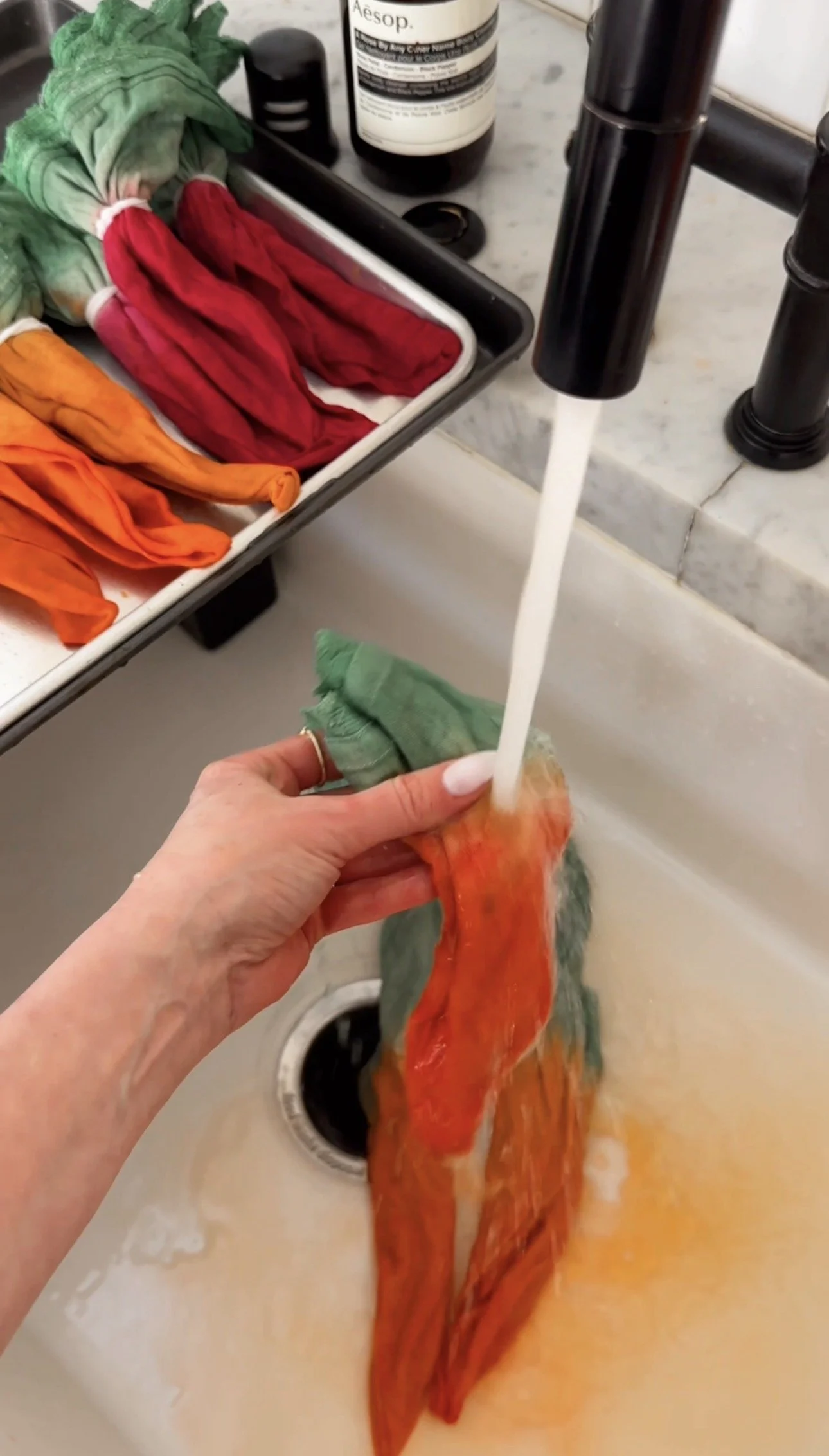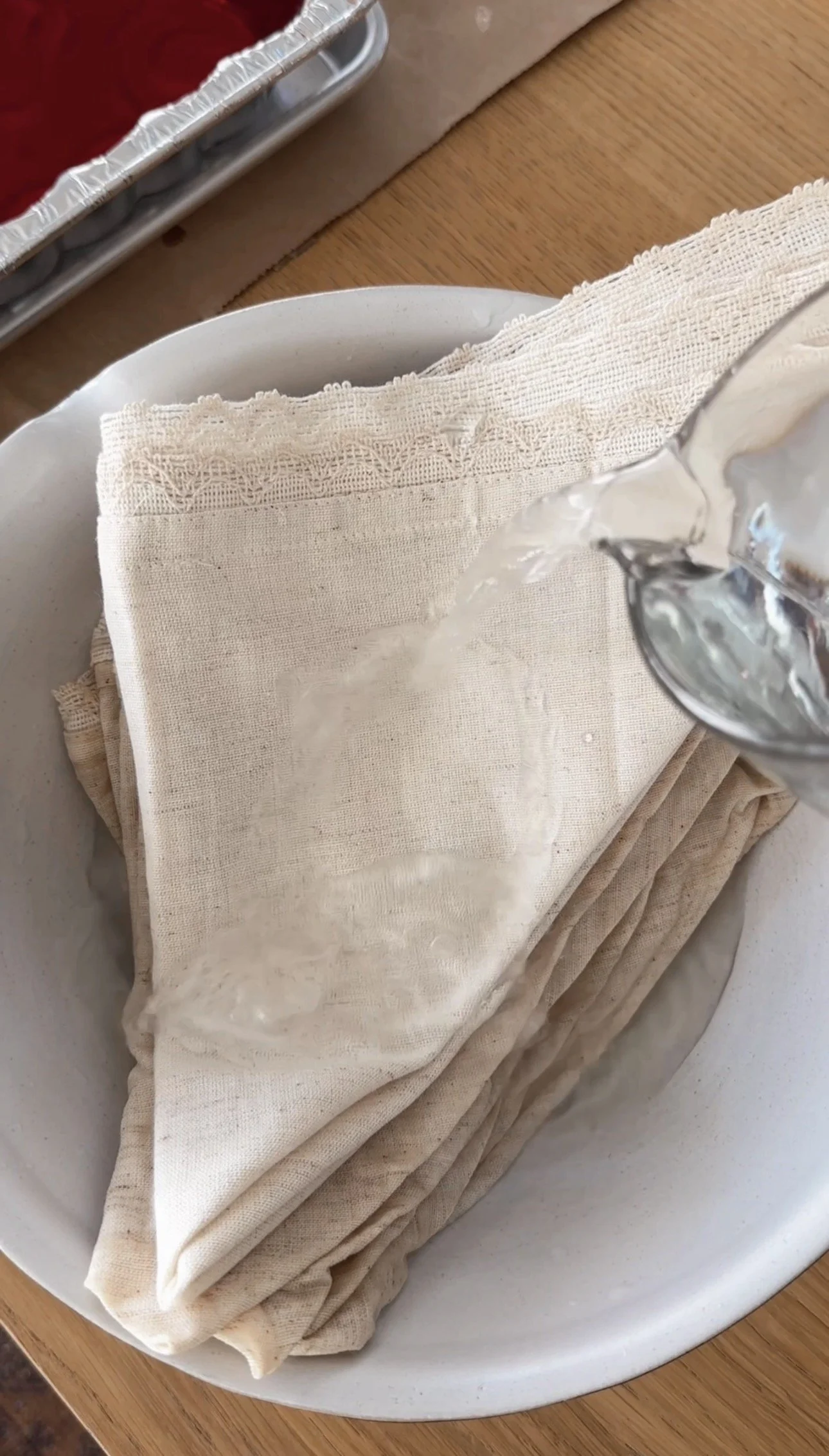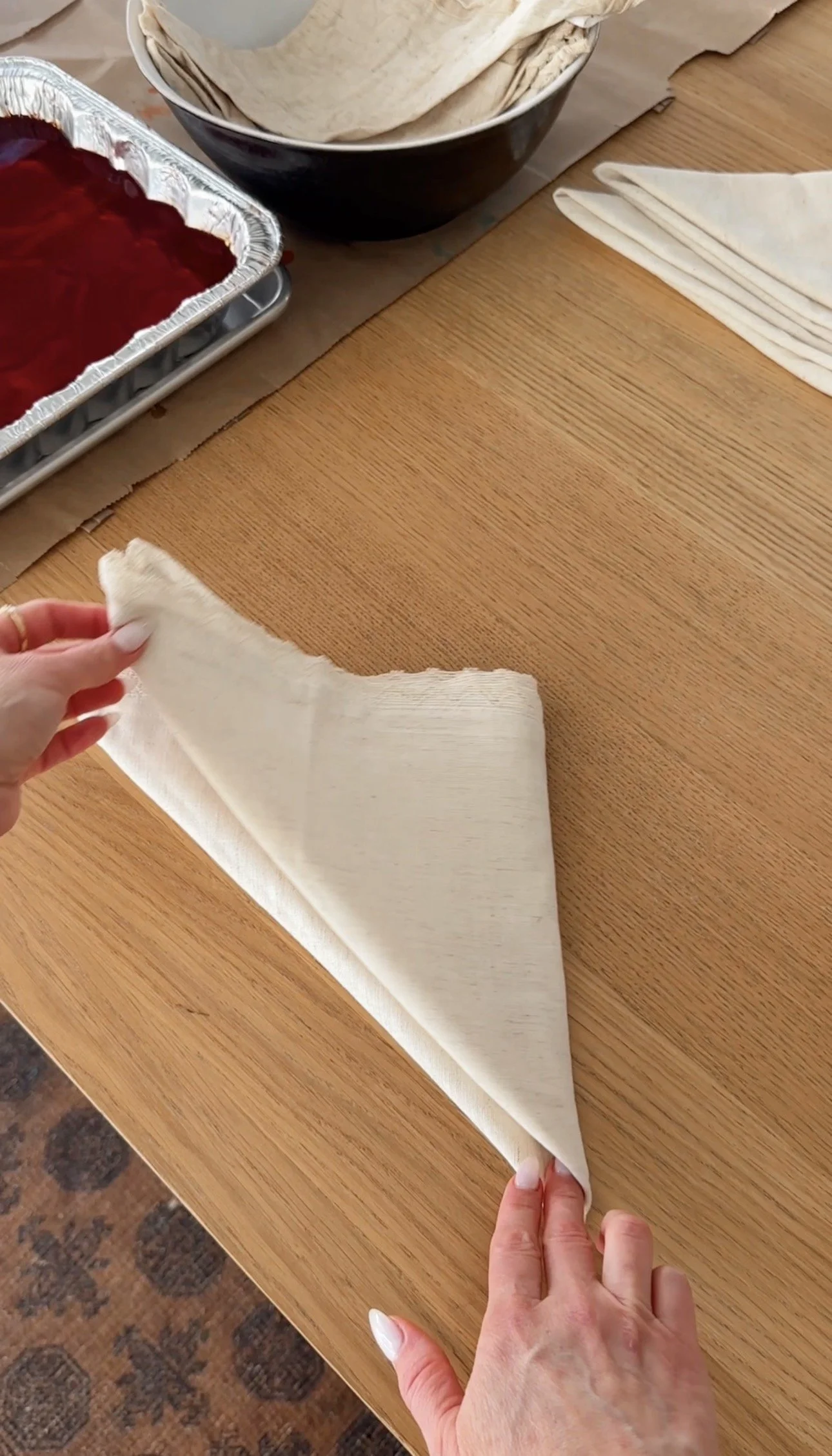 Fold each napkin into a triangle and soak it in warm water first. This helps the fabric absorb the dye more evenly.